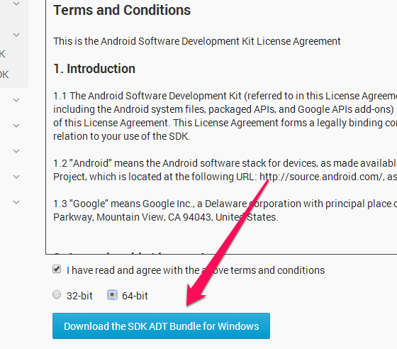 Get the Android developer tools and install the appropriate SDK for your machine. In my case, I got the x64 Windows bundle.